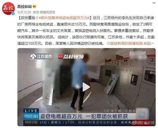 近日,江苏扬州的李先生发现自己承接的厂房两根主电缆被盗,直接损失近10万元。民警排查周围道路监控后,锁定了2辆可疑汽车,其中一名车主的丈夫周某,曾因盗窃电缆入狱服刑。掌握多重线索后,民警很快将周某及其团伙抓获。?经统计,该团伙行踪遍布河南、江苏多地,作案十多起,总案值超过100万元。目前,周某等人因涉嫌盗窃已被批捕。