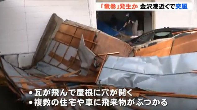 23日下午1时,金泽市有人报警称“龙卷风将电线及砖瓦吹上天”。金泽市政府及警方表示,当地20余栋建筑物遭不同程度损毁,多数为屋顶剥落。还有车被飞起的物体砸中,玻璃碎落一地。金泽港堆积的20个集装箱被狂风吹坏,里面装的物品全部丢失。